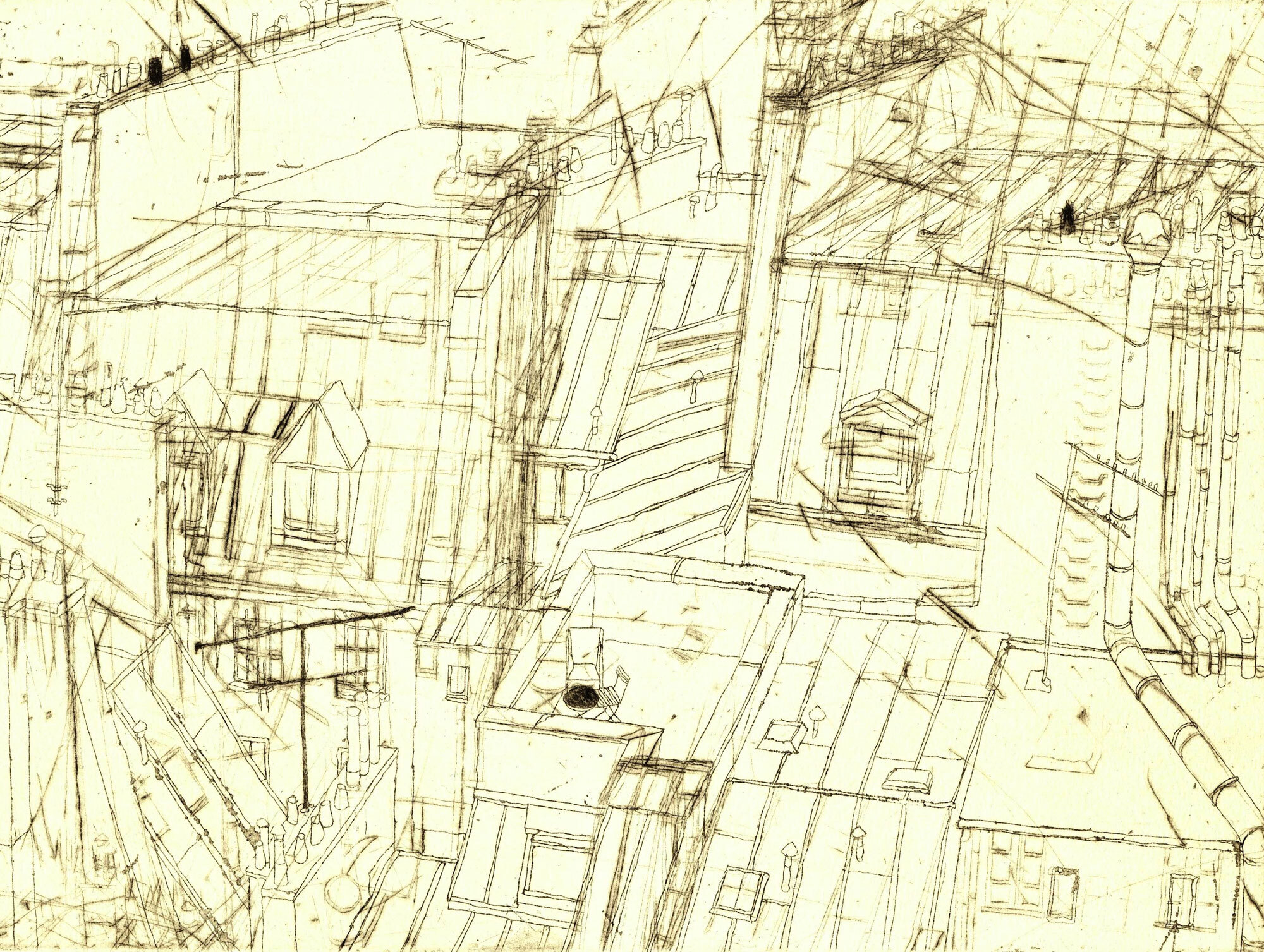 Hinterhof is an etching with aquatint and drypoint printed on handmade paper.